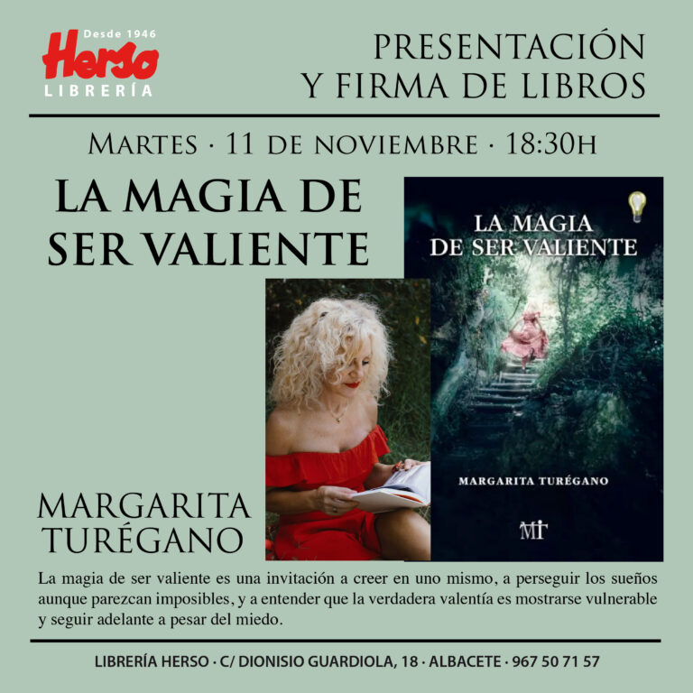 El próximo martes, 11 de noviembre (con motivo del Día de las librerias) contaremos con Margarita Turégano presentando La magia de ser valiente. Una invitación a creer en uno mismo, a perseguir los sueños aunque parezcan imposibles y a entender que la verdadera valentía es mostrarse vulnerable y seguir adelante a pesar del miedo. Os esperamos para aprender muchas cosas buenas!!!